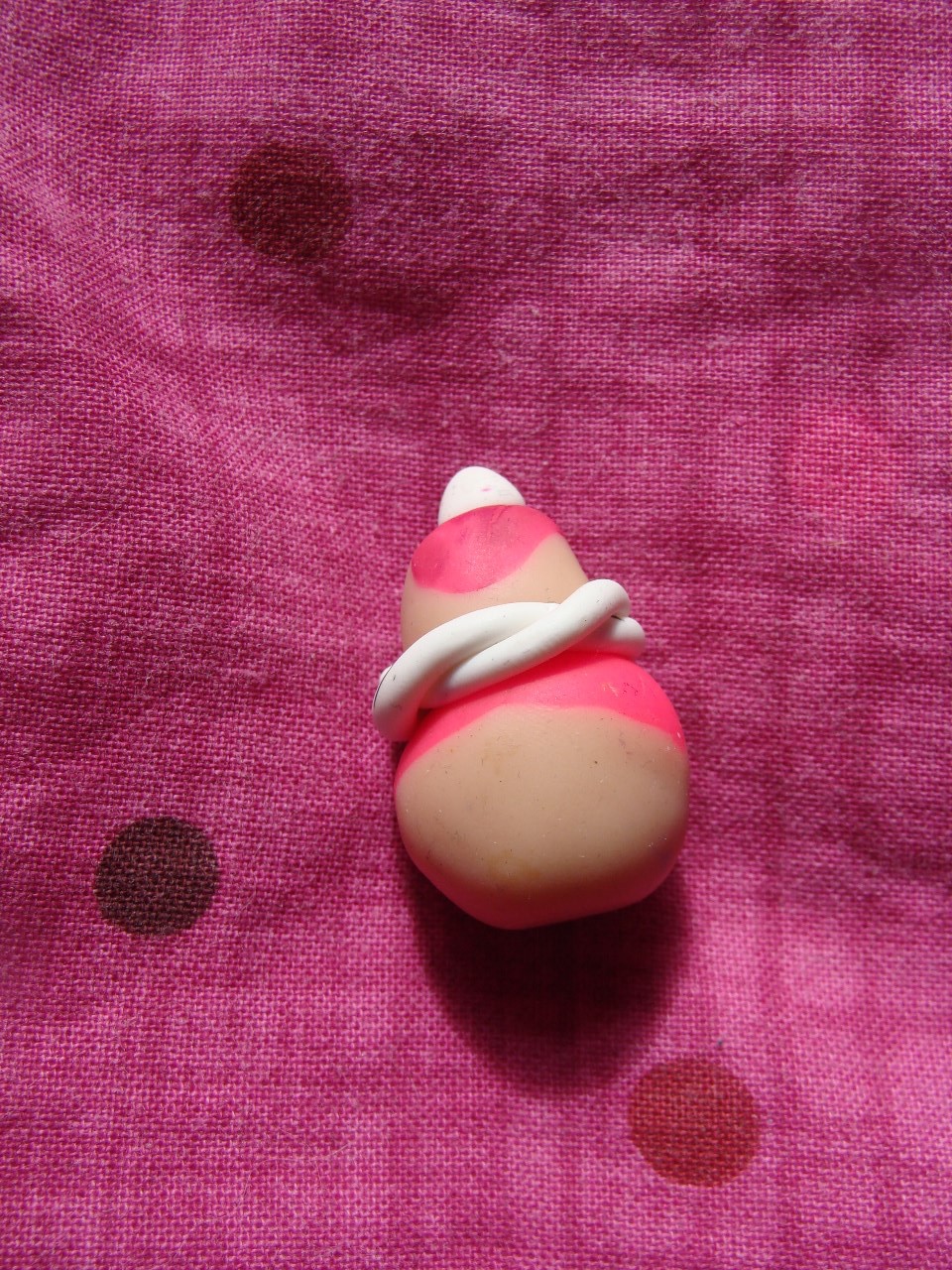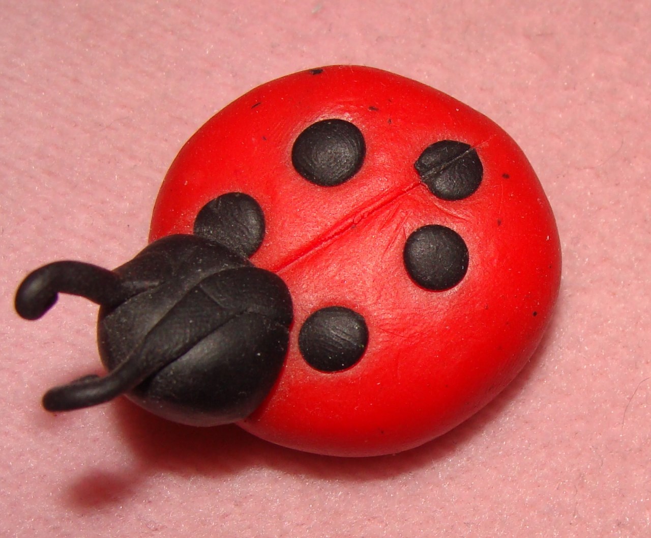 Dabord je fais une petite boule de pâte rouge que j'allonge et m'aigris un peu à un bout et aplatit à l'autre. Ensuite je fais des triangles pour les feuilles et un petit boudin pour la queue, puis je colle des petits traits jaunes.